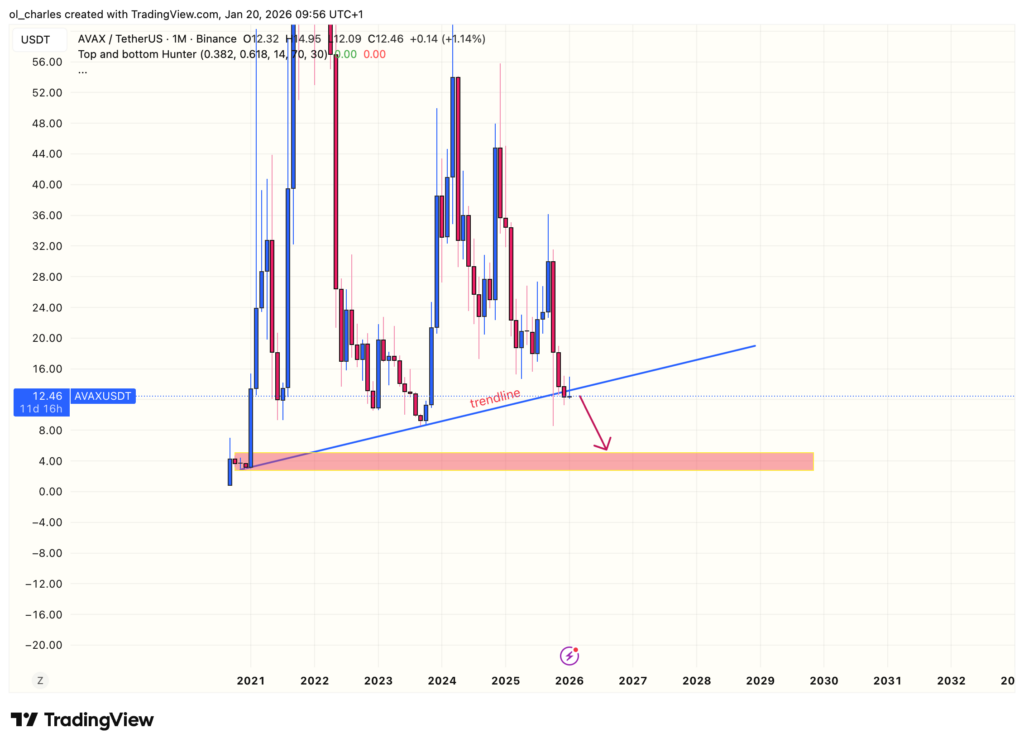 From a technical perspective, AVAX’s market structure offers a concerning outlook. The token is now trading below its bullish trendline on the HTF. If AVAX fails to reclaim $13.2, it risks a crash toward the next demand zone around $5.