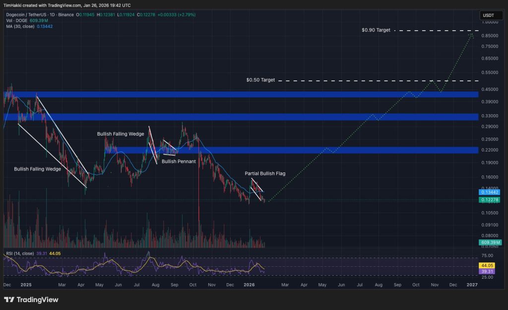 Dogecoin (DOGE) no se queda atrás: la IA menciona un potencial rally hacia 0,90 $, impulsado por un retorno del retail, una especulación cíclica y posibles casos de uso en pagos. Tal subida correspondería a un multiplicador significativo en caso de breakout.