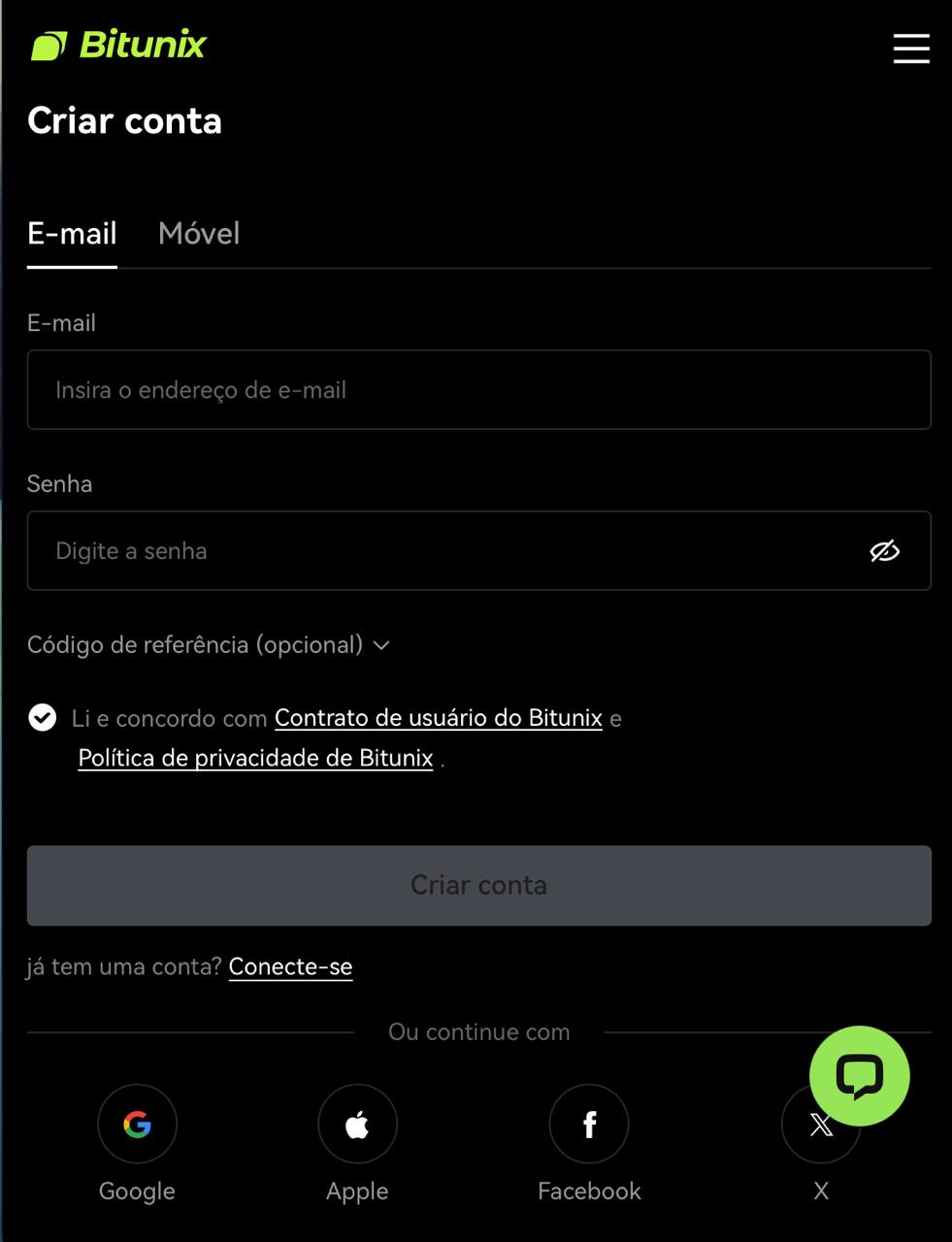 - Inscrição : Acesse o site oficial da Bitunix e clique em “Registar” no canto superior direito. Pode registar-se com o seu endereço de email ou número de telefone, ou através do Google, Apple, Facebook e Twitter.