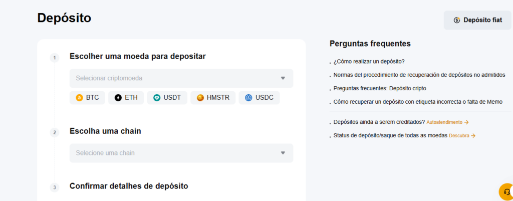 - Aceder à secção “Ativos” ou “Depósito”: Uma vez ligado, procure o separador “Ativos” (“Assets”) ou “Carteira Spot” (“Spot Wallet”). Deverá encontrar aí um botão “Depósito” (“Deposit”). Clique nele.