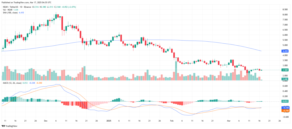 O NEAR está também sendo negociado abaixo da média móvel de 100 dias, indicando que a pressão de baixa ainda está dominante. No entanto, assim como RENDER, o histograma MACD mostra sinais de redução na dinâmica de venda, o que poderia sugerir uma potencial mudança de tendência.
