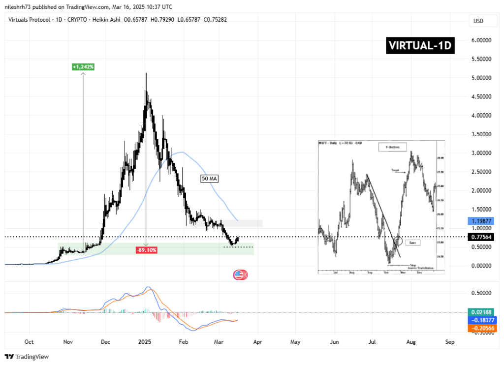 O VIRTUAL encontrou um suporte sólido em $0,48, um nível importante representado em verde no gráfico. A partir desta base, a recuperação começou, levando o preço atualmente em torno de $0,77.